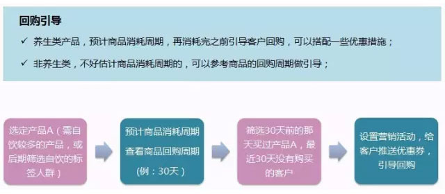 設置循環(huán)活動,每天給前30天那天購買產品A,并且近30天都沒有回購過的客戶做優(yōu)惠券及短信的推送,引導客戶進行回購